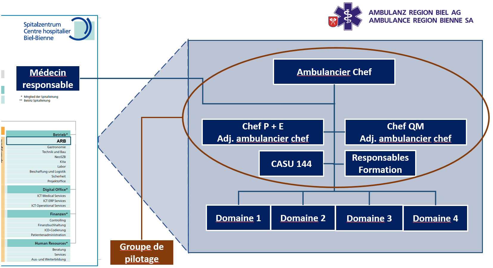 Ambulance Région Bienne SA (ARB SA) est la société de transport des malades et blessés des services de secours de la région de Bienne et environs. Sa centrale d’intervention traite environ 40’000 appels par année et ses véhicules assurent quelque 7’000 interventions, réparties entre les transports de malades et les secours. Constitués en société anonyme en 1996, les services de secours sont une filiale du Centre hospitalier Bienne SA, actionnaire majoritaire avec 66,6% des parts. Les 33,3% des actions restantes appartiennent à la commune de la ville de Bienne.